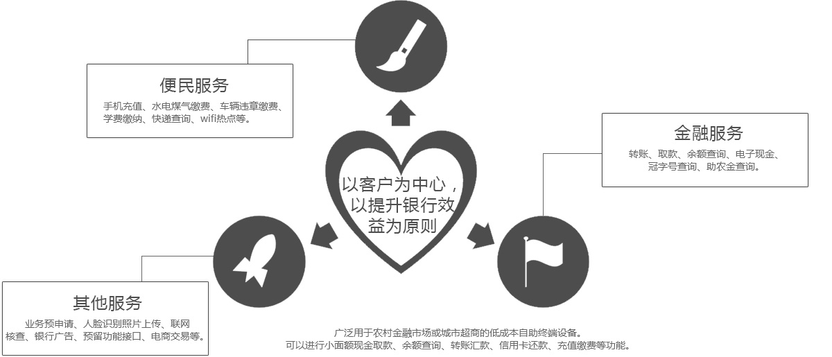 為幫助解決銀行業(yè)面臨的互聯(lián)網(wǎng)金融、金融脫媒、利率市場化、行業(yè)競爭加劇、成本高、盈利下降等挑戰(zhàn),同時響應國家助農(nóng)政策號召。 我司研發(fā)一款專門針對農(nóng)村金融市場或商超等特定場景而開發(fā)的可以查詢,轉(zhuǎn)賬,取現(xiàn),收單、信用卡還款,手機話費充值等,同時可疊加本地特色業(yè)務(wù)(水、電、煤代繳、助農(nóng)補貼、社保等)的柜立式金融便民終端。終端可解決銀行ATM機網(wǎng)點固定、單一且投放量不足的問題。整機總體高度約140cm,外觀設(shè)計符合人體工程學,操作舒適